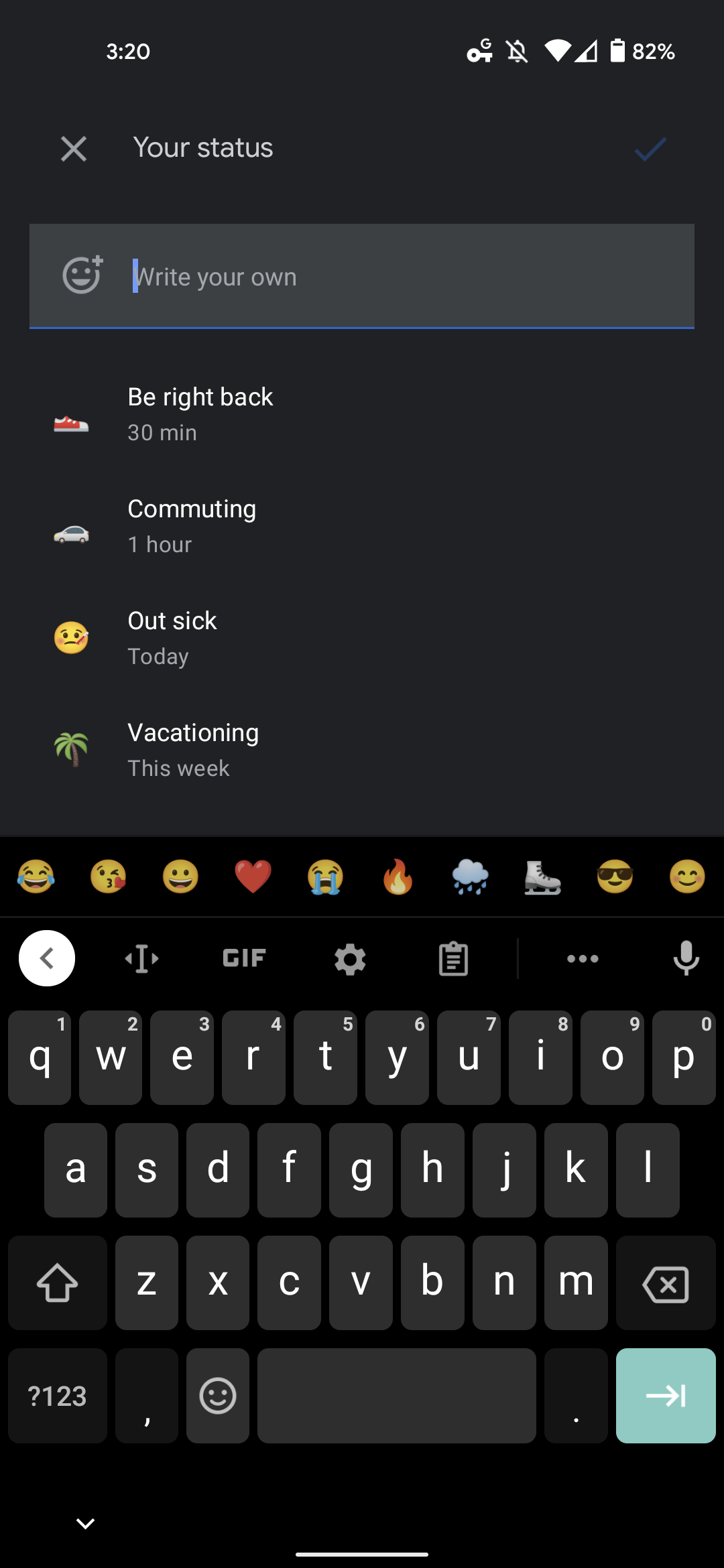 4. Appuyez sur pour ouvrir une fenêtre contextuelle « Votre statut » avec des valeurs par défaut telles que: « Revenez tout de suite » (30 minutes), « Trajet quotidien » (1 heure), « Malade » (Aujourd’hui), « En vacances » (Cette semaine).
